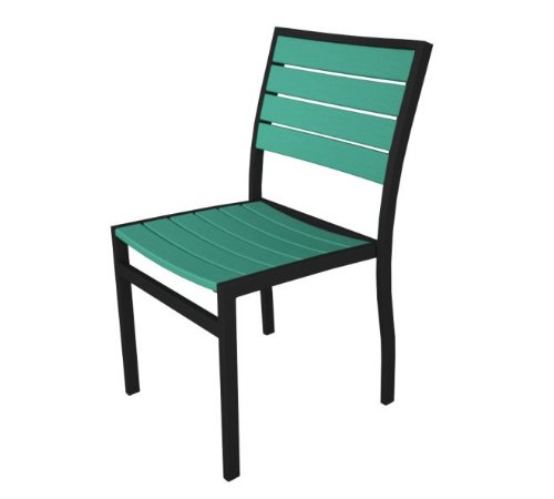 2 Patio Chairs/aqua blue with black frame/all weather/made of recycled plastic bottles and steel hardware/33.5''H x 18.75''W x 21.75''D/17.25'' from bottom of chair to top of seat/wash with soap and water/assembly needed/inside or outside use/made in USA/allow up to 10 additional days to ship, made to order/you get two of the item shown